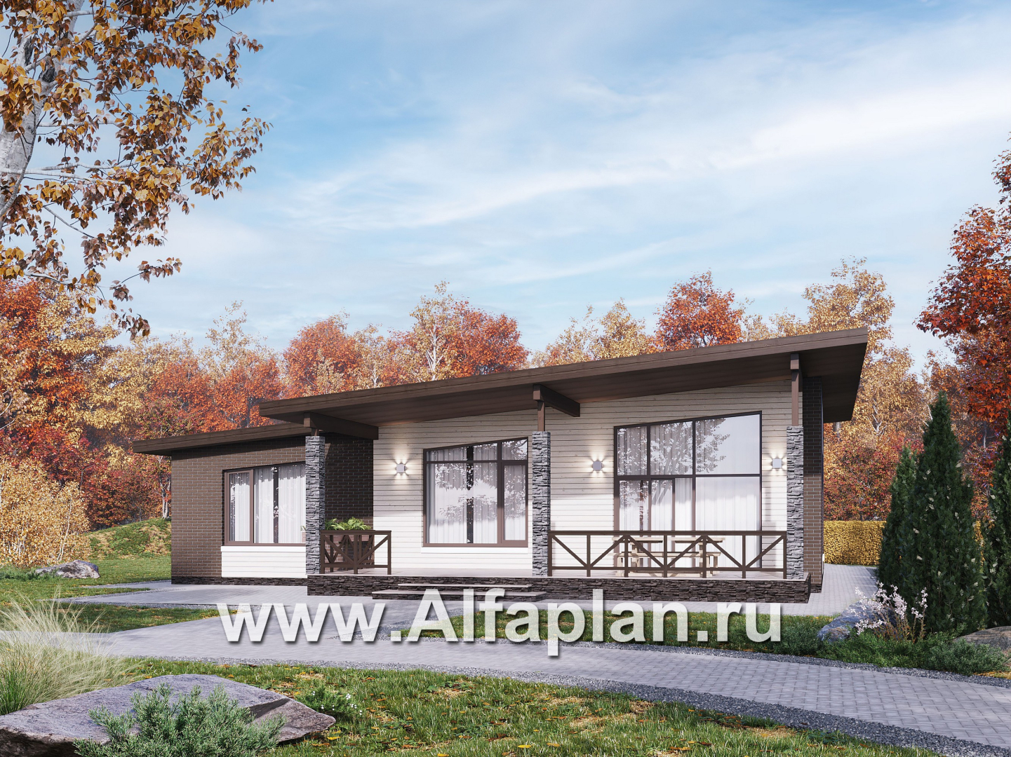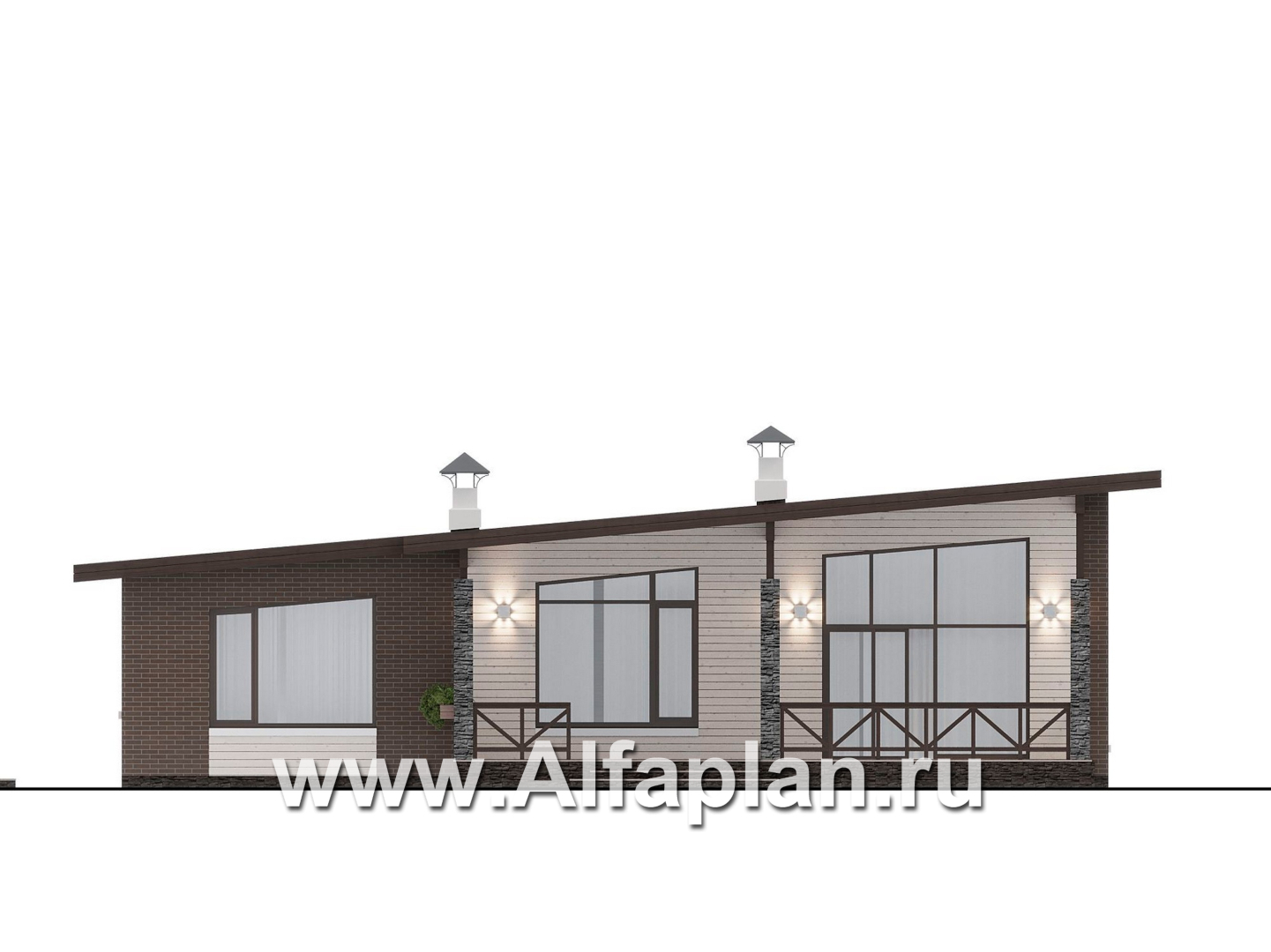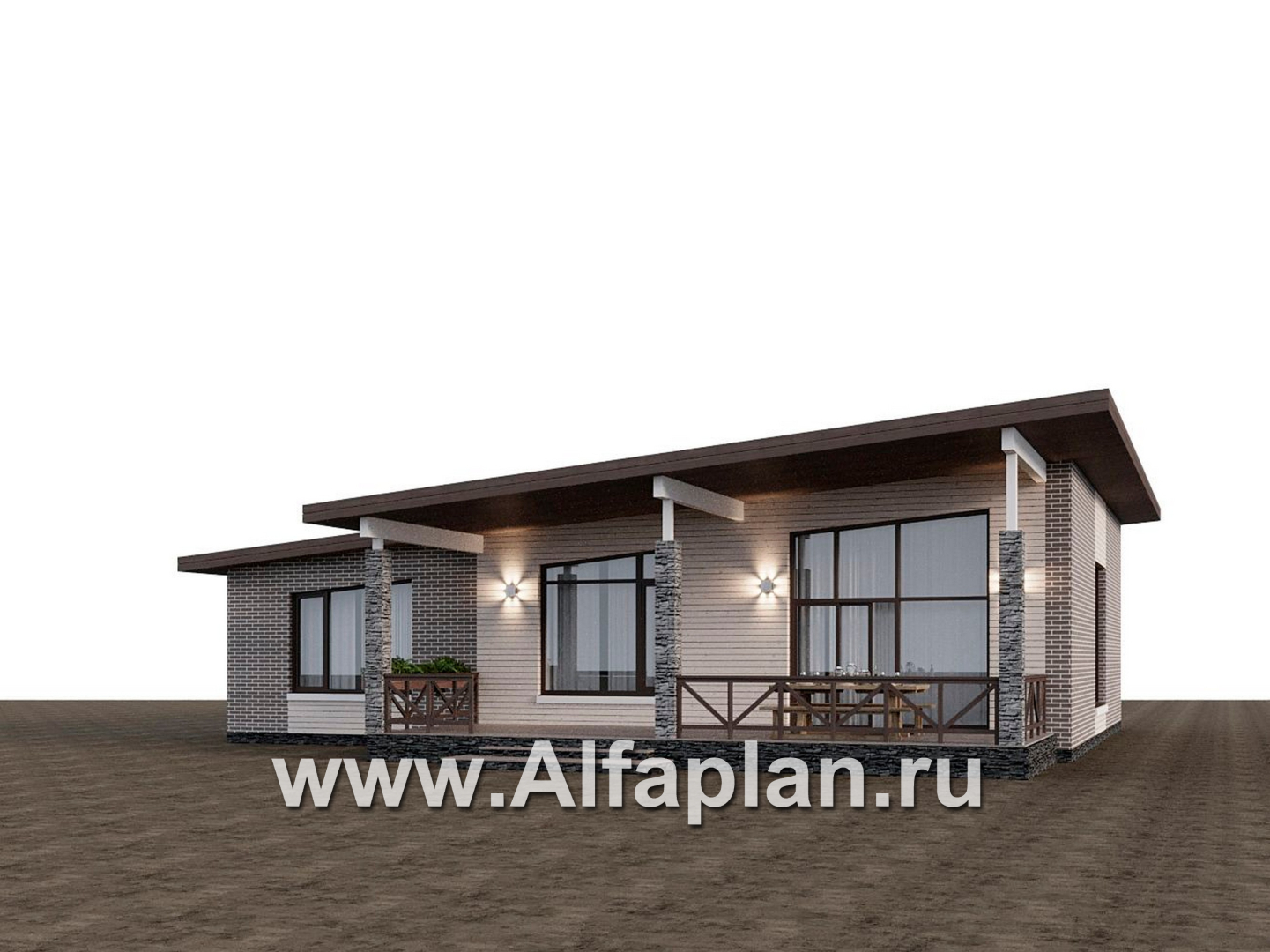 «Стрелец» -проект современного одноэтажного дома с террасой со стороны входа, с односкатной крышей