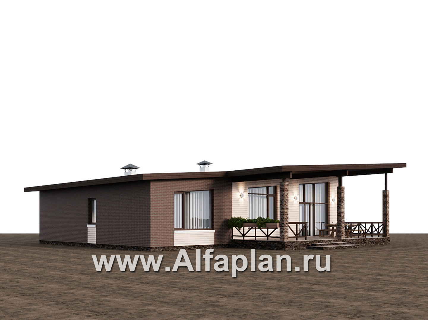 «Стрелец» -проект современного одноэтажного дома с террасой со стороны входа, с односкатной крышей - технические характеристики