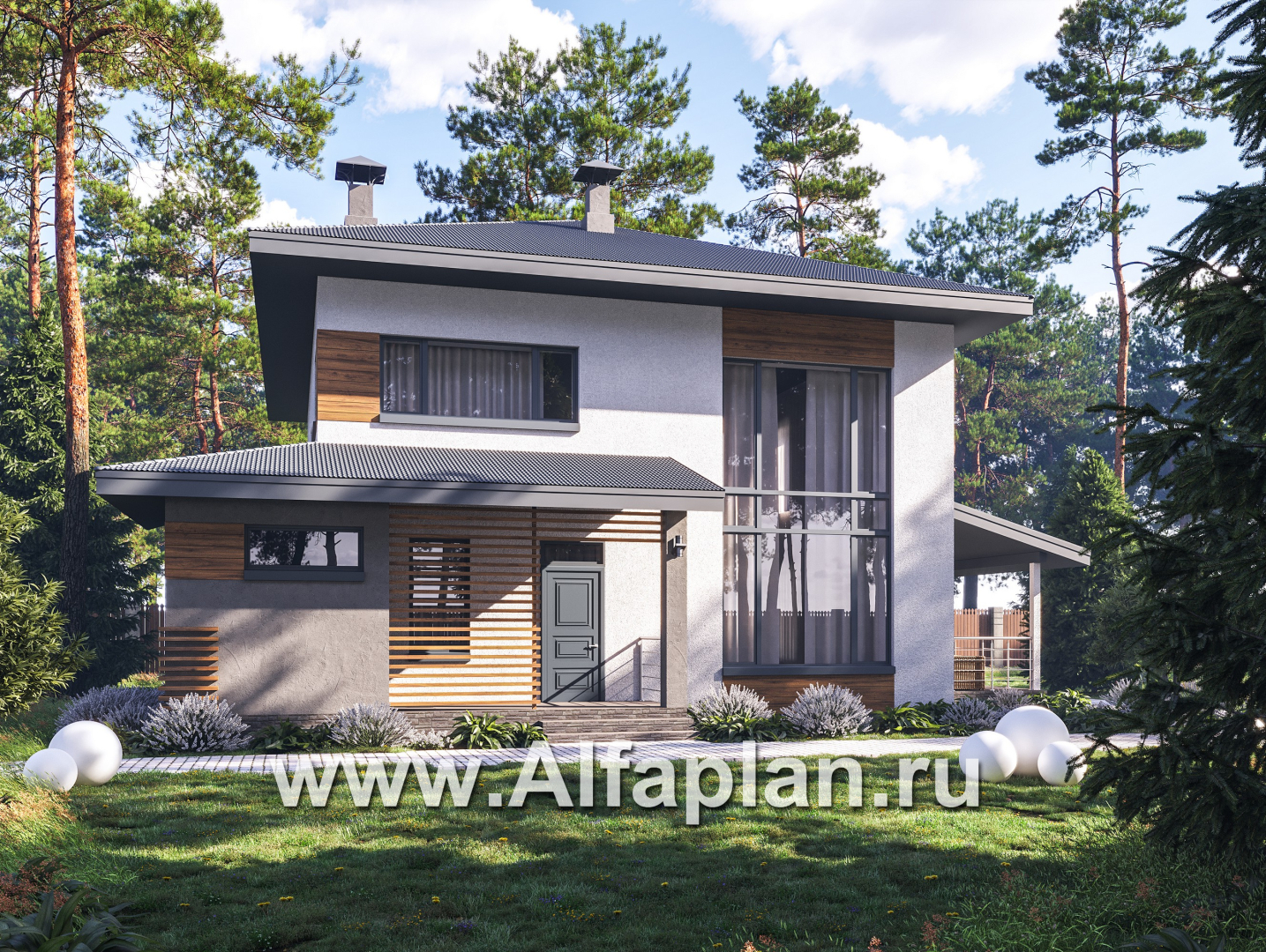 1054B-S «Чистая линия» - проект дома, 2 этажа, с двусветной гостиной, с террасой, в современном стиле
