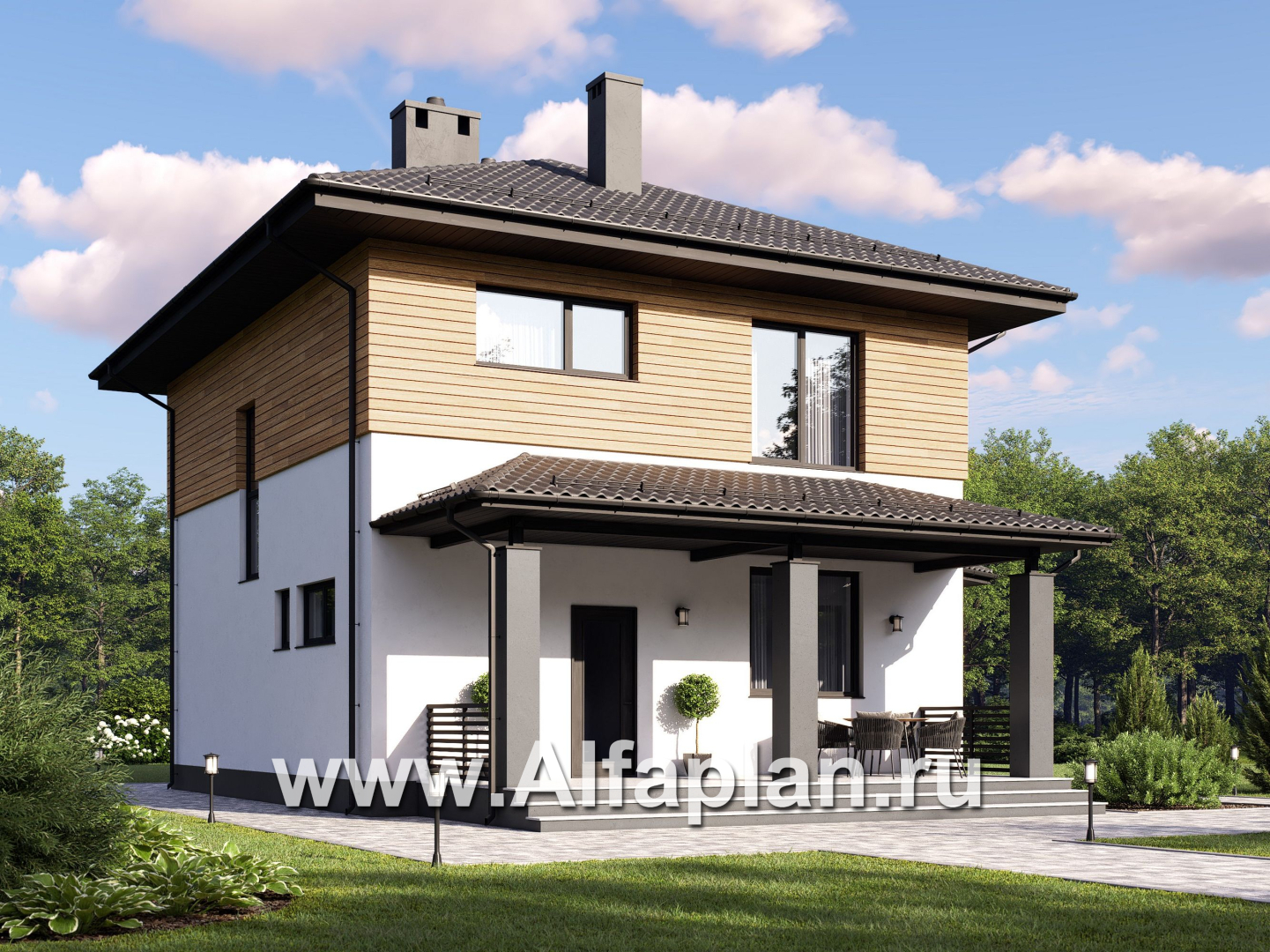 Экономия и максимальный комфорт – главные составляющие предлагаемого проекта. Небольшому семейству подойдет двухэтажный компактный дом, который снабжен всем необходимым для удобного проживания. Внешний дизайн объекта отличается строгостью линий и теплой цветовой гаммой.