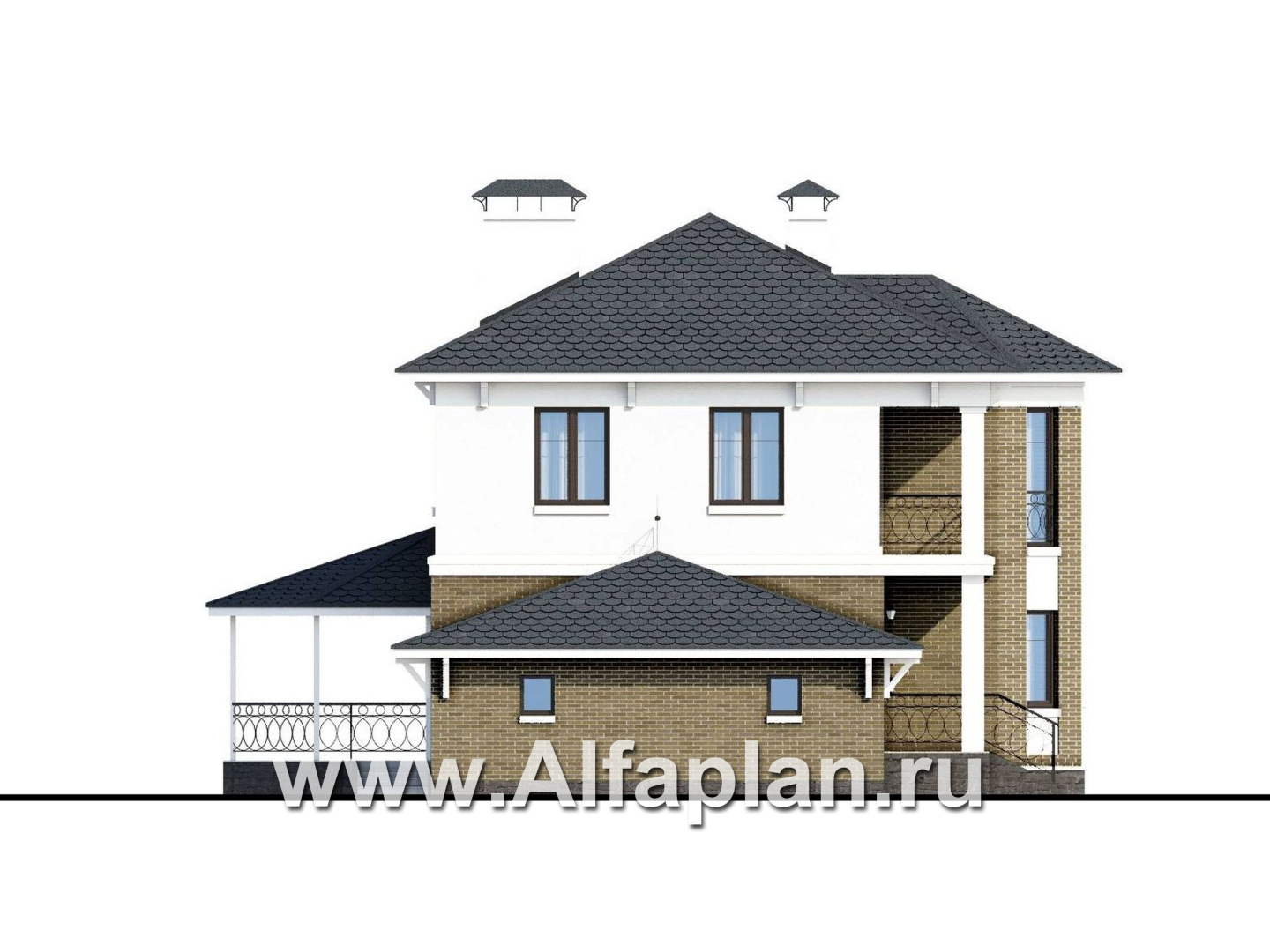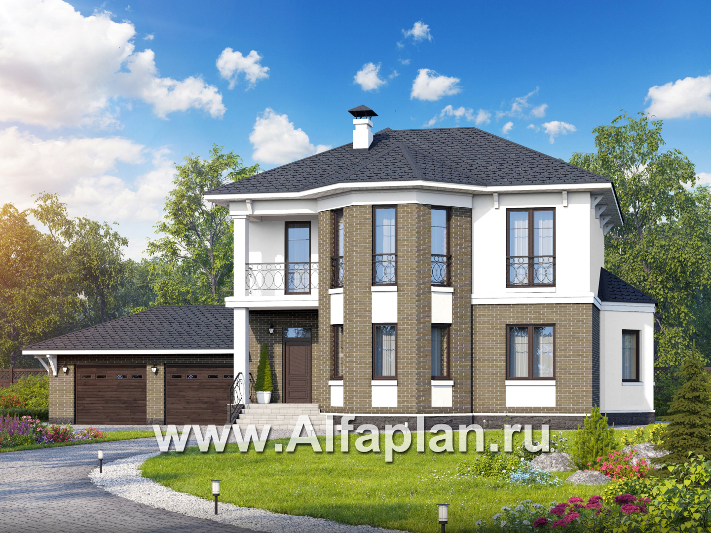 «Классика» - проект двухэтажного дома с эркером, планировка с кабинетом на 1 эт и с террасой, с гаражом на 2 авто