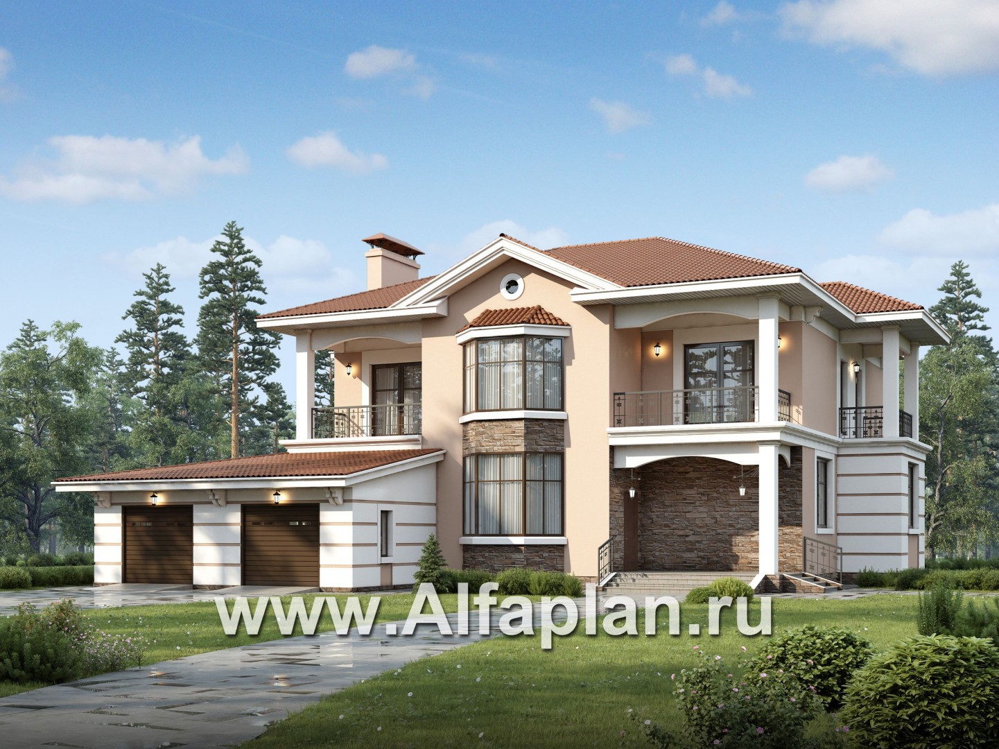 Респектабельный коттедж с гаражом на два автомобиля – комфортное и престижное жилье для состоятельных заказчиков. Рассмотрим повнимательнее данный проект. В первую очередь обратим внимание на внешний облик дома. Главными украшениями коттеджа, несомненно, являются эркер и балконы второго этажа. Если участок позволяет вынести гараж за пределы дома, то центральный фасад будет выглядеть полностью симметричным.   В доме два полноценных по высоте этажа. Для отделки наружных стен применялась штукатурка с последующей покраской. Цвета выбраны  приятных постельных оттенков. В отношении материала, выбранного по проекту для строительства наружных стен – здесь предусматривается вполне стандартная, хорошая альтернатива. Возвести наружные стены можно как из газобетонных блоков, так и из кирпича. Следовательно, данный коттедж 127А можно причислить в «проекты кирпичных и газобетонных домов». Кровля крыши дома и гаража из битумной черепицы. Цоколь, части эркера и стены входа в дом облицованы натуральным камнем. Во всем царит надежность и продуманность. В проекте кроме поэтажной планировки предусмотрен объемный просмотр внутренних помещений - так называемая виртуальная прогулка. Воспользуйтесь ей.