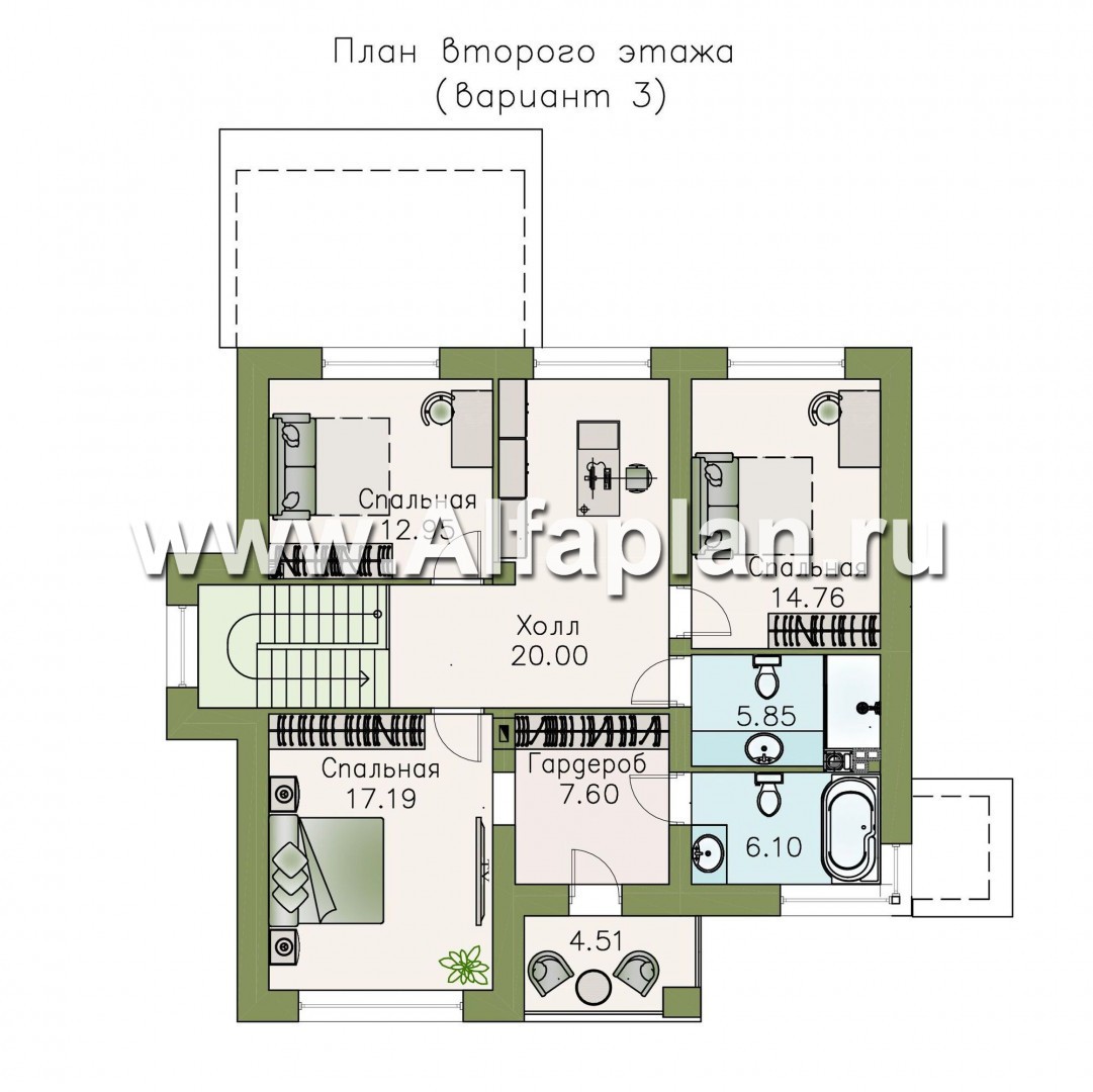 Планировка второго этажа предусматривает три спальни, и комнату, где можно поставить компьютер. Эту комнату можно закрыть перегородкой, или включить в состав холла.