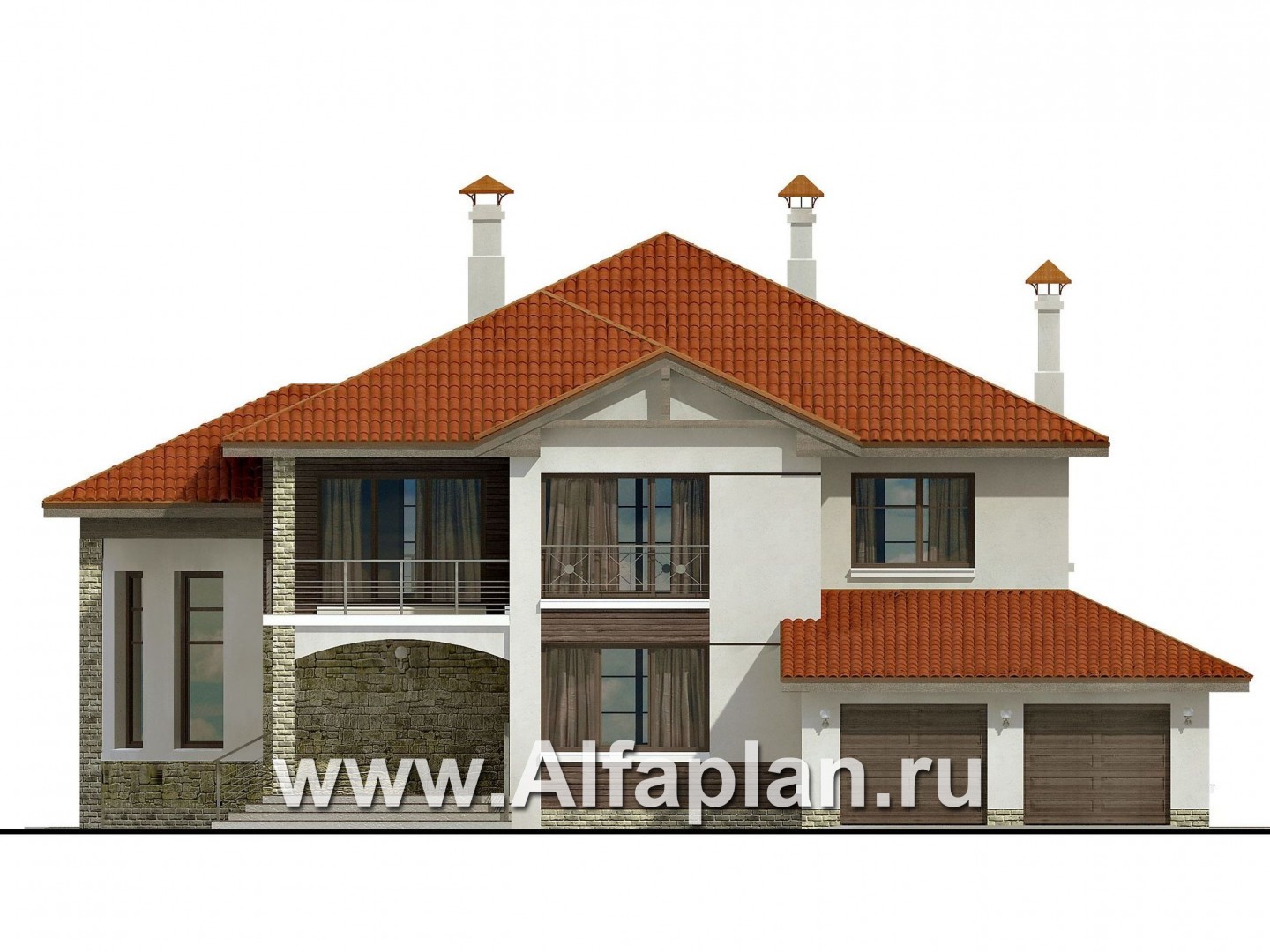 Респектабельный особняк с полукруглой двусветной гостиной по праву можно отнести к жилью бизнес-класса. Хотелось бы отметить характеристики применяемых строительных материалов для наружной отделки. Цоколь дома,  колонны, ступеньки и  части стен отделаны искусственным камнем. Кровля покрыта натуральной керамической черепицей. В отношении материалов для возведения наружных стен этого коттеджа можно сказать одно – это хорошее, стандартное решение. В строительстве предусмотрена следующая альтернатива – кирпич или газобетонные блоки. Так что этот объект можно отнести к «проектам кирпичных и газобетонных домов». Данное жилье рассчитано на большую семью, с возможностью принимать гостей и не чувствовать стесненности, потому что места будет достаточно всем. В доме просторная планировка, большие помещения, предусмотрены подсобные и служебные помещения. Дом имеет хорошее естественное освещение, благодаря высоким и обширным окнам.
