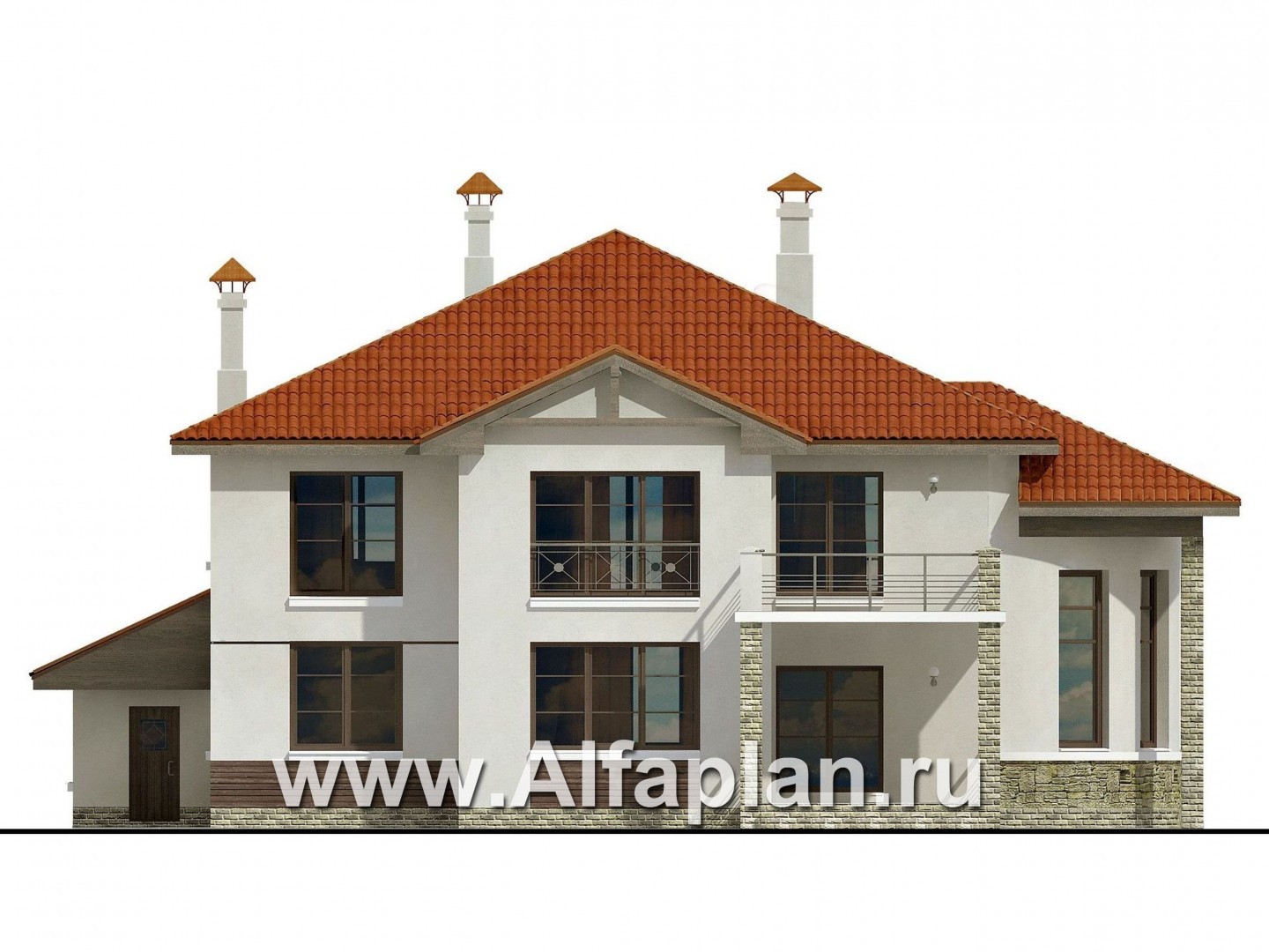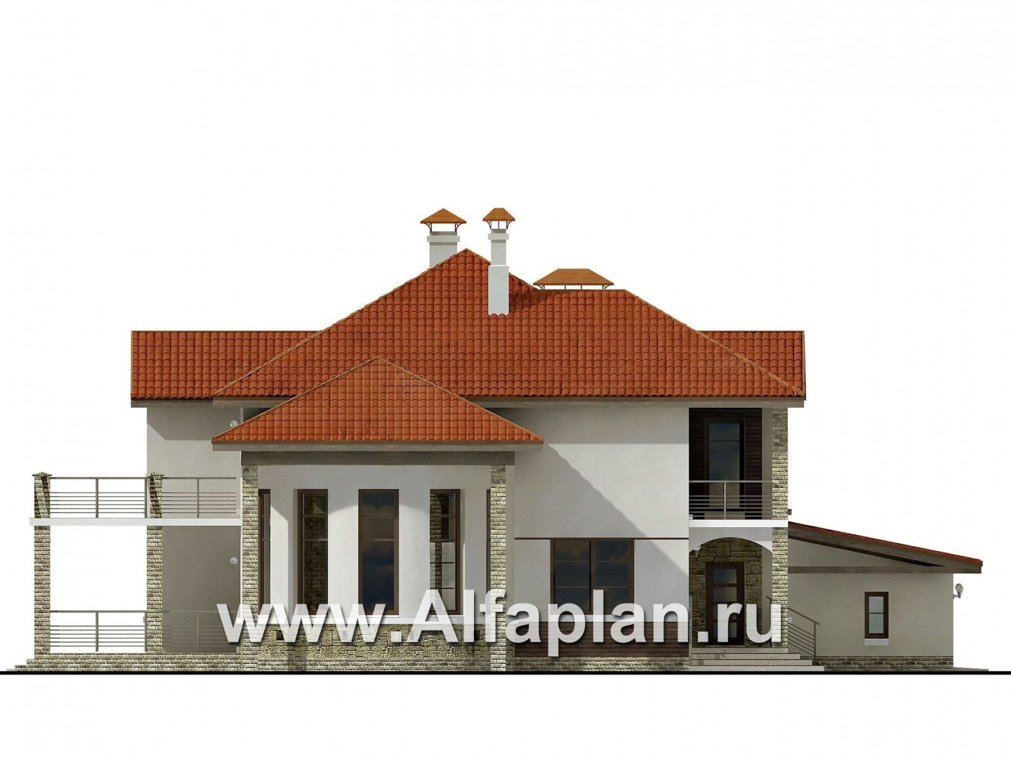Необычная форма двусветной гостиной задает тон внутренней планировке дома и его внешнему облику. С кухней и столовой гостиная образует единое пространство. На крытую террасу есть выход из гостиной. В прихожей предусмотрена гардеробная. Еще одна гардеробная сблокирована с ванной и комнатой для стирки и глажки. Справа от входа расположен кабинет, который и будет служить комнатой отдыха для гостей.  Из тамбура можно попасть в гараж на два автомобиля, а из него пройти в техническое помещение, где находится отопительный котел.  На втором этаже расположены четыре спальни и две ванные комнаты. Две спальни, выходящие на главный фасад, имеют двери на общий балкон. Из холла  также можно выйти на просторный балкон, который находится над верандой. Этот балкон станет отличным местом для вечернего отдыха.  Чердак по проекту не эксплуатируемый, для его обслуживания предусмотрен лаз и выдвижная лестница. Стоит напомнить, что в проекте предусмотрен объемный просмотр внутренних помещений, так называемая Виртуальная прогулка, которой вы можете воспользоваться, если что-то нужно рассмотреть повнимательнее. Также в проекте заложено зеркальное изображение особняка и его поэтажная планировка.
