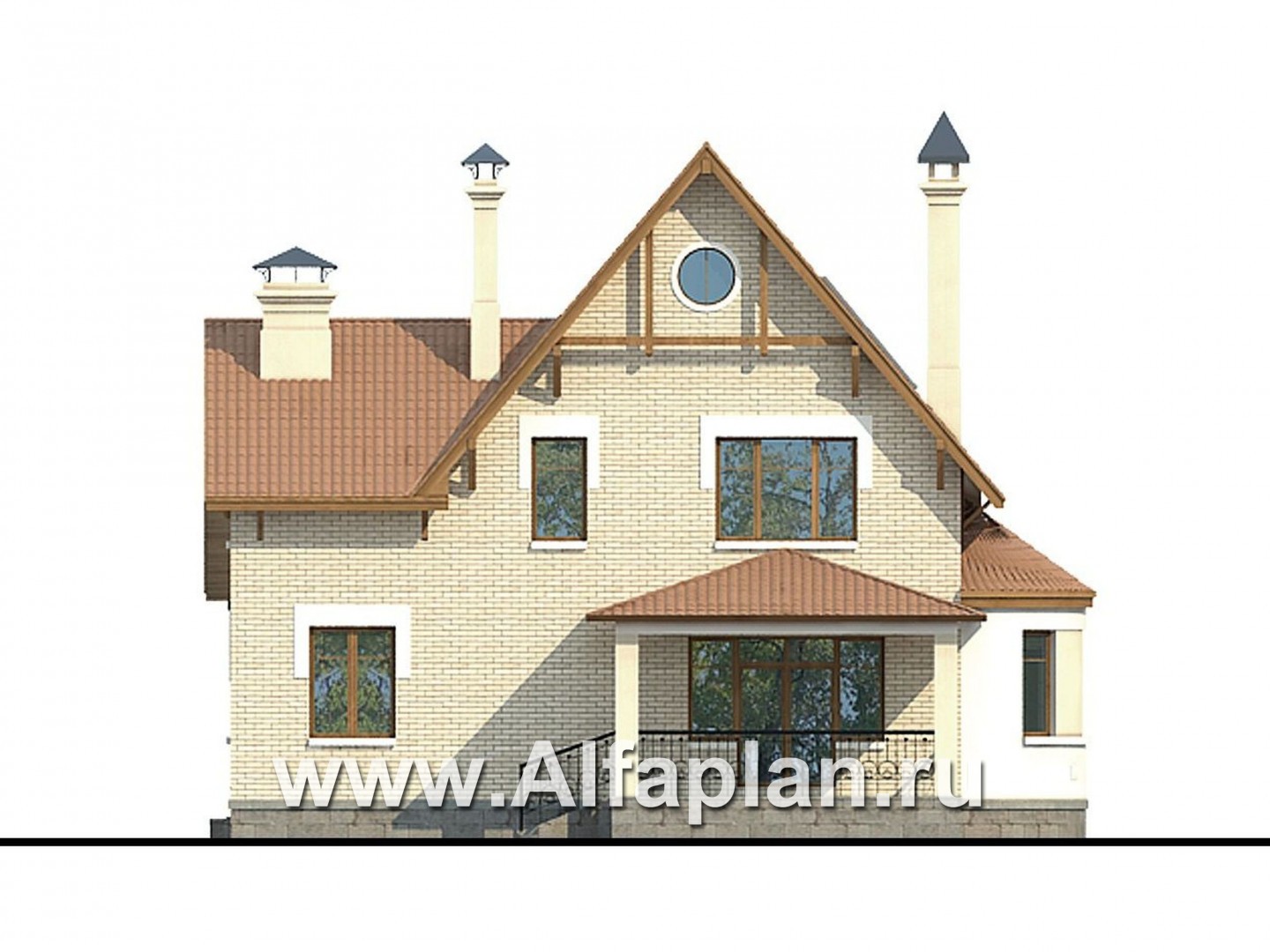 Cовременный загородный дом с комфортной  универсальной планировкой и выгодной архитектурой.  Предельно эффективное использование площади  позволяет получить пять жилых комнат, не считая гостиной. Облик этого дома в целом – воплощение внешнего уюта, солидности и благородства. Коттедж 356B годен и для постоянного проживания, и также может быть пригоден в качестве загородной резиденции (в качестве загородного жилья для небольшой семьи этот вариант  будет просто великолепно подходить!). Крыша дома двускатного типа. Особенную солидность и особенный внешний уют дому придает выделяющийся фахверк фасада и лоджия второго этажа, занимающая эркерную площадь. На этой лоджии также находится большое арочное окно и красивое ограждение. Кроме этого, в коттедже имеется еще весьма удачное крыльцо, просторное и с мощными колоннами. Крыльцо располагается под общей кровлей, что означает то, что летом здесь всегда будет затененное пространство, а в зиму снег не будет вас заваливать сверху. Наружные стены в соответствии с проектными требованиями могут быть построены из двух материалов – газобетонных блоков или из кирпича. В этом смысле данный проект вхож в спаренную рубрику «кирпичные и газобетонные дома». Использование различных по фактуре и цвету отделочных материалов позволит получить массу разнообразных вариантов этого дома.