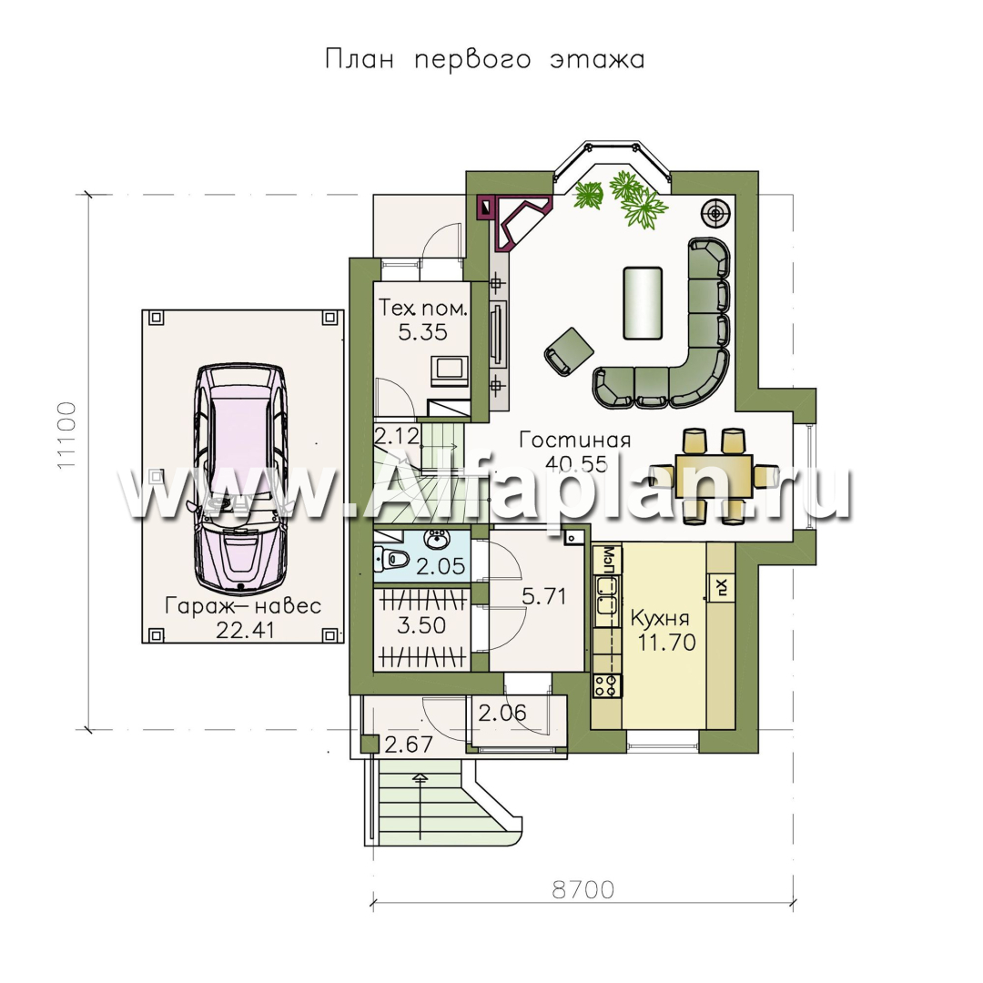 «Менестрель» - проект дома из блоков, с навесом на 1 авто, для узкого участка