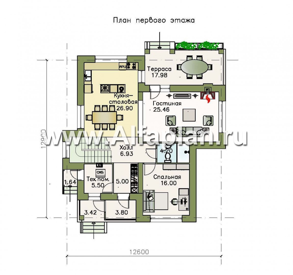 Пространство первого этажа кирпичного (пенобетонного, газобетонного) дома разделено на три функциональных зоны. Гостевая группа, представленная гостиной с камином, кухней-столовой, а также террасой с собственным выходом во двор, смещена к дворовому фасаду. При желании гостевое пространство не составит труда превратить в большую студию со сквозным освещением. Кроме прочего, увеличить ее площадь можно за счет холла с лестницей на второй этаж.