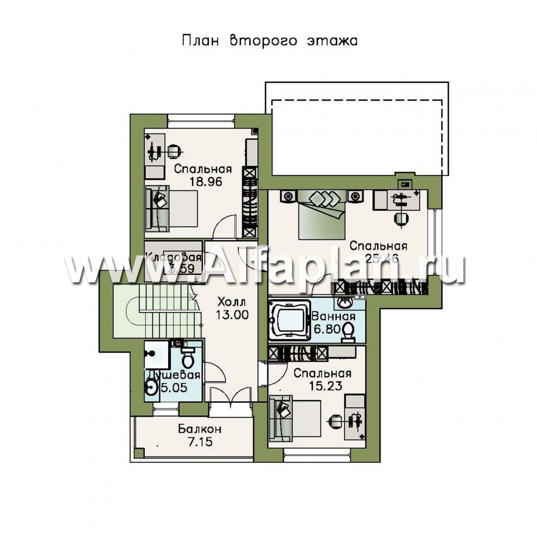 В основном приватная группа сосредоточена на втором этаже. Проект кирпичного (газобетонного, пенобетонного) дома предусматривает, помимо помещения на первом этаже, еще три спальни, не равнозначных по площади. Большая спальня оборудована собственной ванной комнатой, кроме того, на этаже предусмотрен и общий санузел. Все помещения, включая небольшую кладовую, сосредоточены вокруг холла, выходящего на балкон.