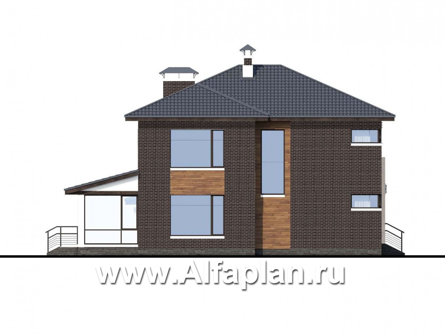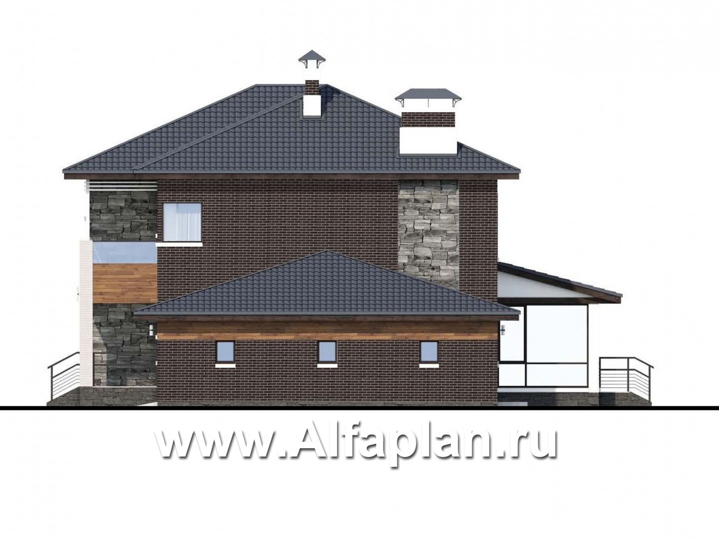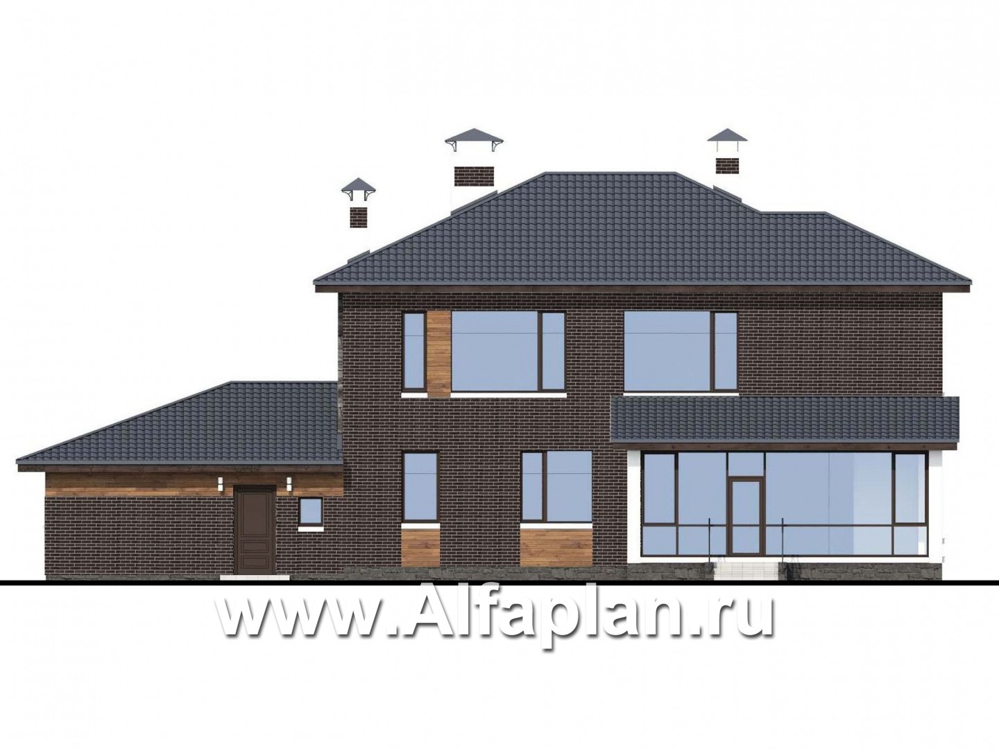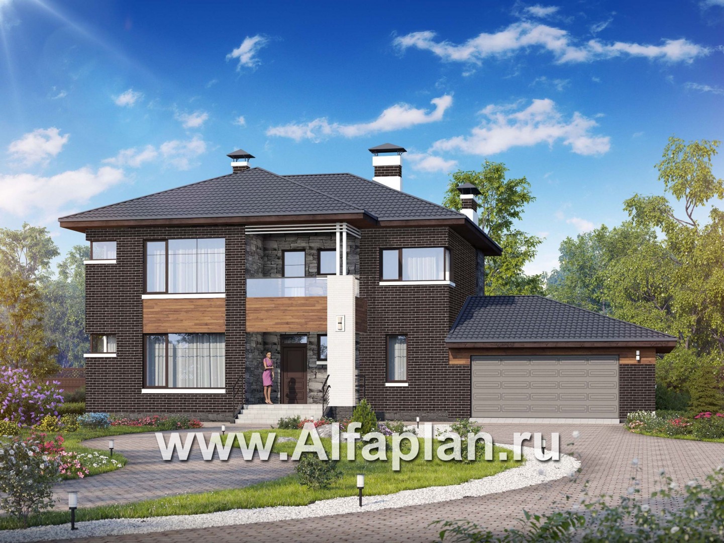 560E-S «Прайд» - проект современного двухэтажного дома, мастер спальня, с террасой и сауной, гараж на 2 авто, фасад из кирпичей