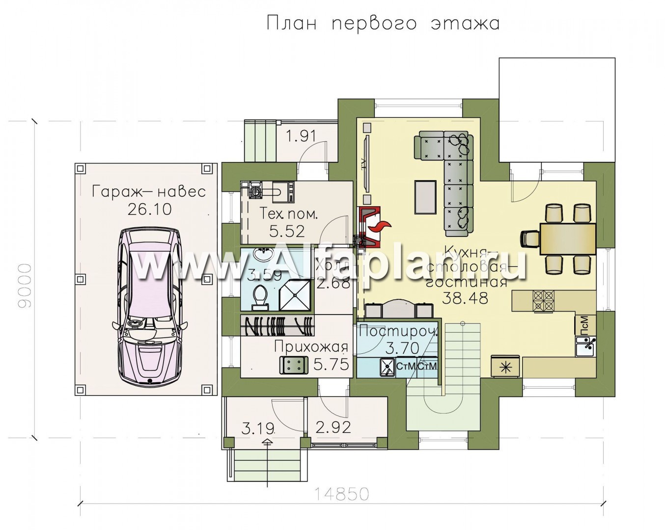 Проектом кирпичного (газобетонного) дома предусмотрено два этажа, причем второй этаж – мансардного типа. Пространство первого этажа преимущественно отдано под гостевую зону: это большое помещение студийного типа, в котором объединены гостиная, кухня и столовая. Гостевое пространство расширено за счет пристроенного помещения – террасы, расположенной со стороны дворового фасада. Она может быть открытой или с кровлей, произвольной площади – все зависит от пожеланий заказчика.