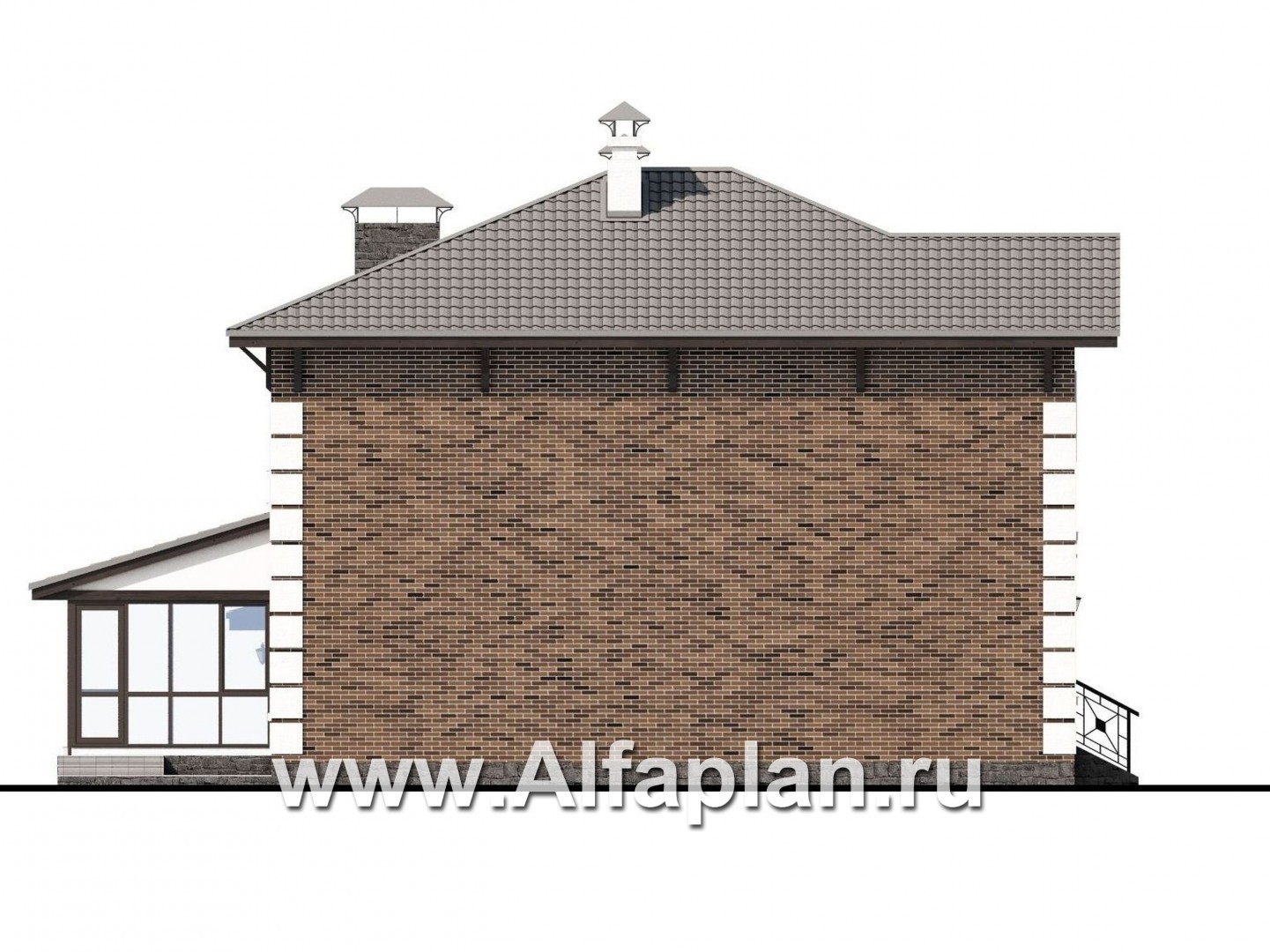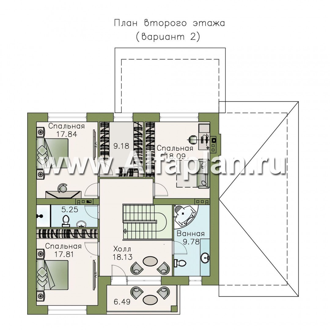 Мансардный этаж в этом проекте не предусмотрен. Выход на чердак осуществляется через лаз с выдвижной лестницей, находящийся в холле второго этажа. Площадь чердака 57м2 (при высоте от пола до низа стропил не менее 1100).Наружные стены разработаны в шести вариантах для возможности адаптации к различным климатическим зонам строительства и предусмотрены из газобетона или пустотного кирпича (альтернативно), т.е. и тот и другой материал заложен в проекте, рассчитан в спецификации. Конструкция стены многослойная: 375 мм - газобетон (пустотный кирпич 380 мм) + слой утеплителя- мин. вата (от 50 до 150 мм, толщина варьируется в зависимости от климатической зоны) + воздушная прослойка + облицовочный кирпич (85-120мм). Общая толщина стены 540-580мм.