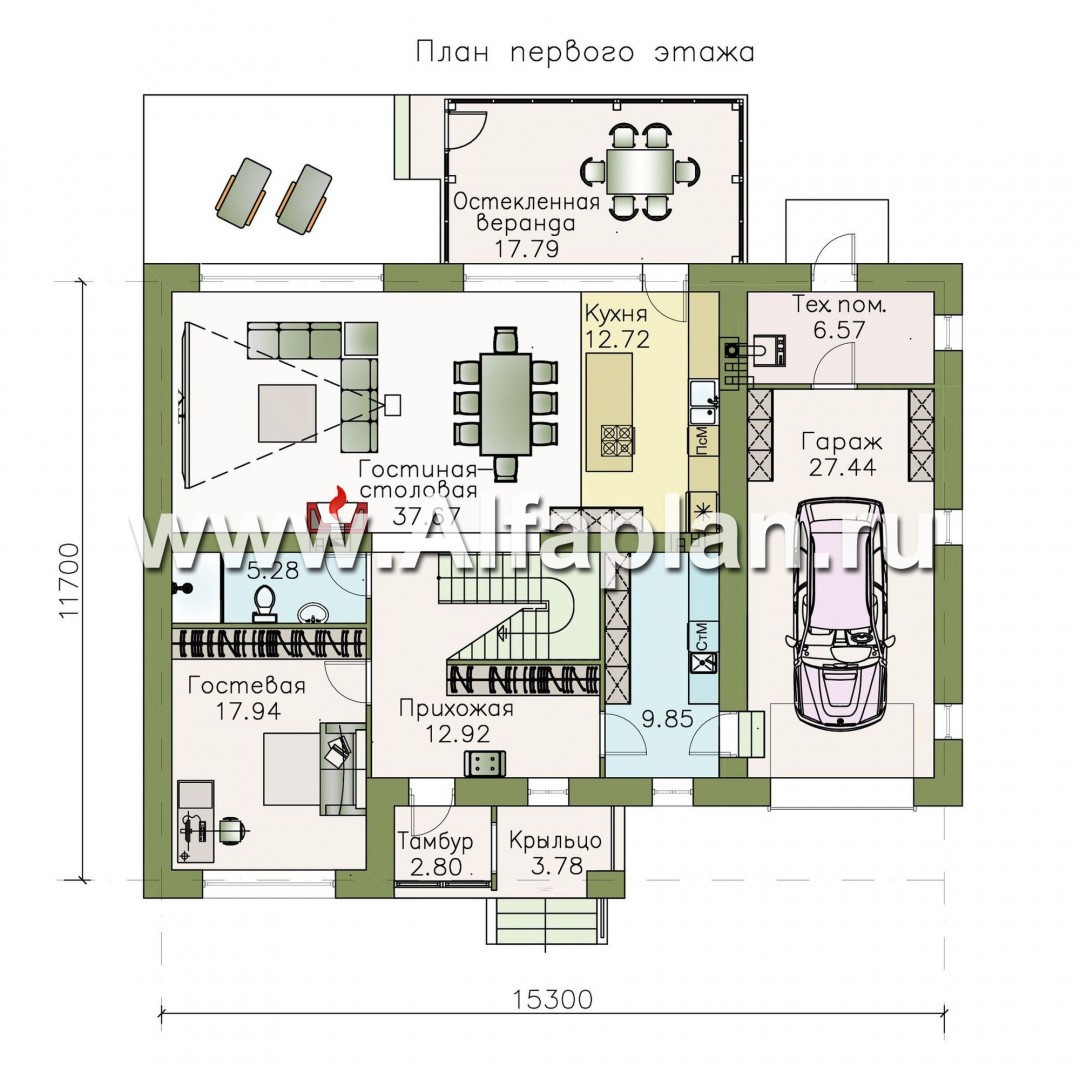 «Седьмая высота» - проект двухэтажного дома, лестница в центре, с кабинетом и с сауной, с гаражом