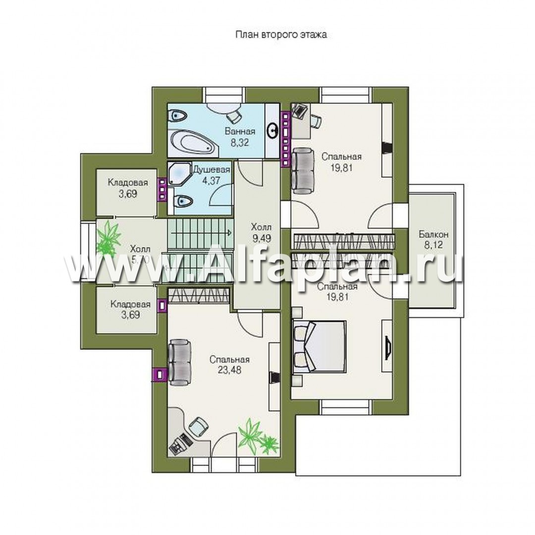Второй этаж – это ночная зона. Три спальни выходят в холл, где есть душевая и ванная для общего пользования. Одна из комнат имеет площадь 24 м² и предназначается для гостей, две остальные, равные по площади (20 м²), имеют выход на балкон.  В холле, расположенным за лестничным маршем, обустроены две кладовые по 4 м², они могут иметь разнообразное назначение.
