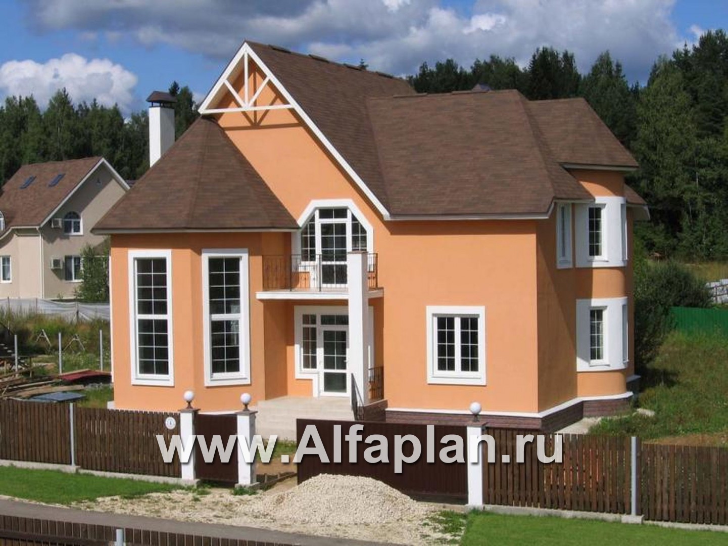 Двухэтажный дом,  архитектура которого выполнена в романтическом характере с применением элементов стиля модерн. В этом проекте удачно подобрано сочетание оттенков отделочных материалов: желтый облицовочный кирпич и коричневая кровля дома. В фундаменте дома заложена монолитная железобетонная плита, а наружные стены  предусмотрены из двух материалов: газобетонных блоков и кирпича. Таким образом, дом входит в проекты газобетонных домов и проекты домов из кирпича.  Проект этого коттеджа имеет довольно интересную конфигурацию: с фасада здания располагается мощный трехгранный эркер, а с боковых сторон дома выстроено два полукруглых эркера поменьше. Вход в дом украшает кирпичная колонна, соединяющая крыльцо и балкон второго этажа. Удачно выбрано решение в оформлении ограждения крыльца и балкона коваными секциями.
