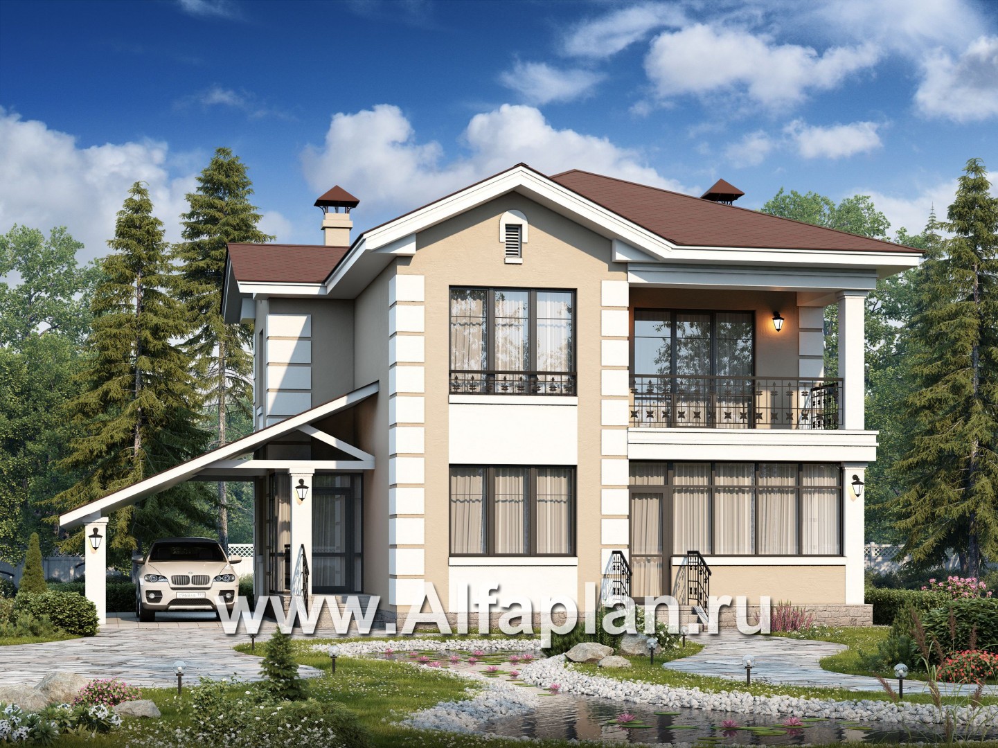 «Знаменка» - проект двухэтажного дома из газобетона, планировка с эркером и с террасой, с навесом на 1 авто