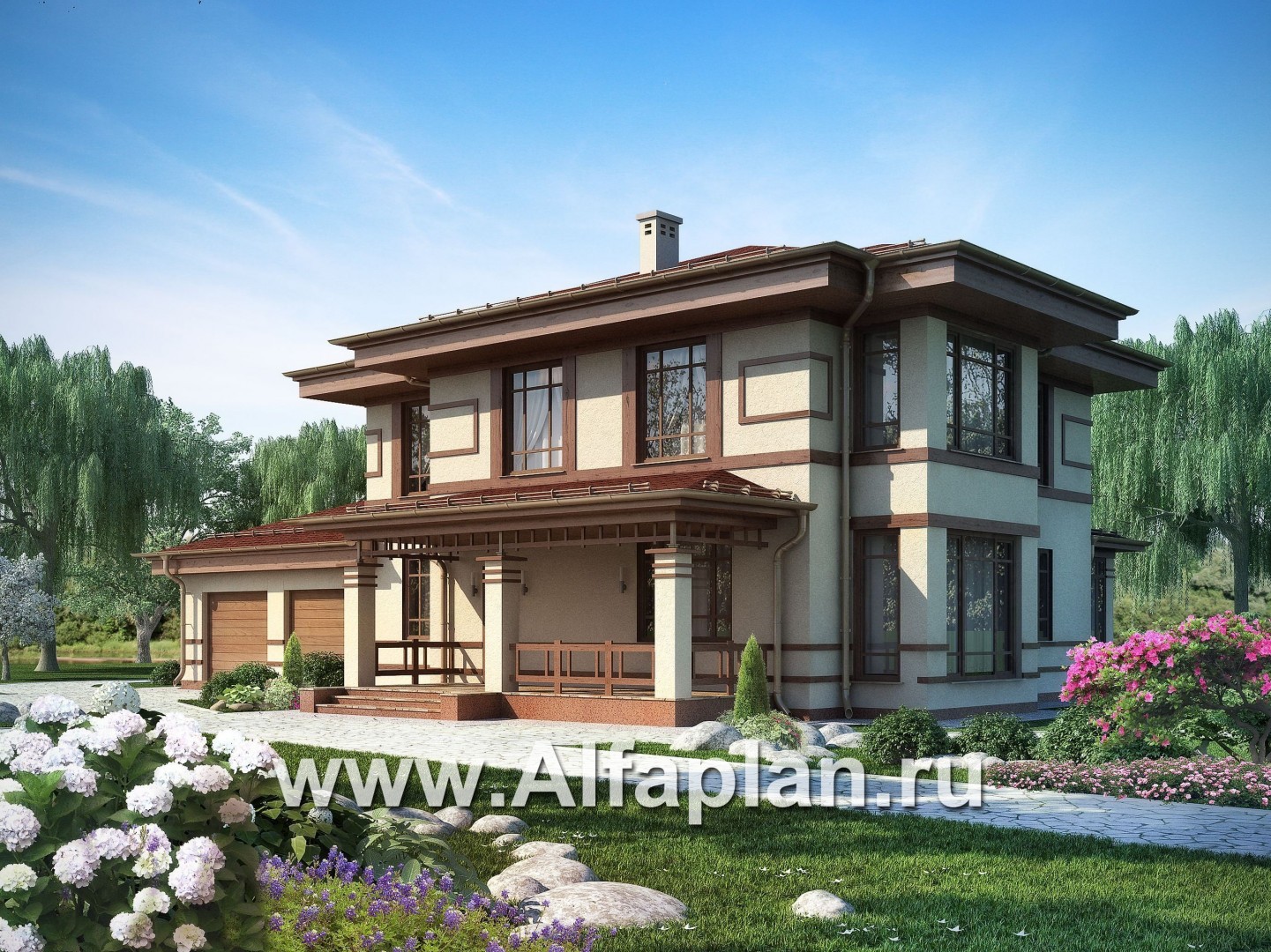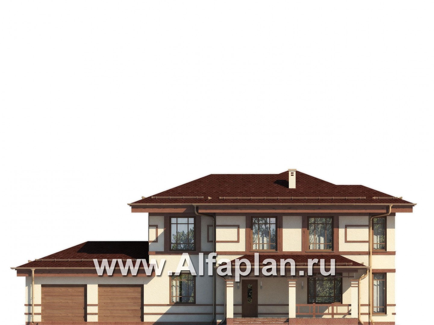 Проект двухэтажного дома, планировка с террасой со стороны входа и с эркером, с гаражом на 2 авто