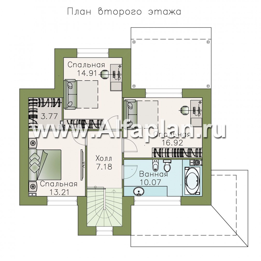 Второй этаж проекта дома из газобетона (кирпича) «Территория комфорта» отдан под приватные зоны отдыха. Здесь расположены три спальни и санузел, размеры которого предполагают установку ванны.