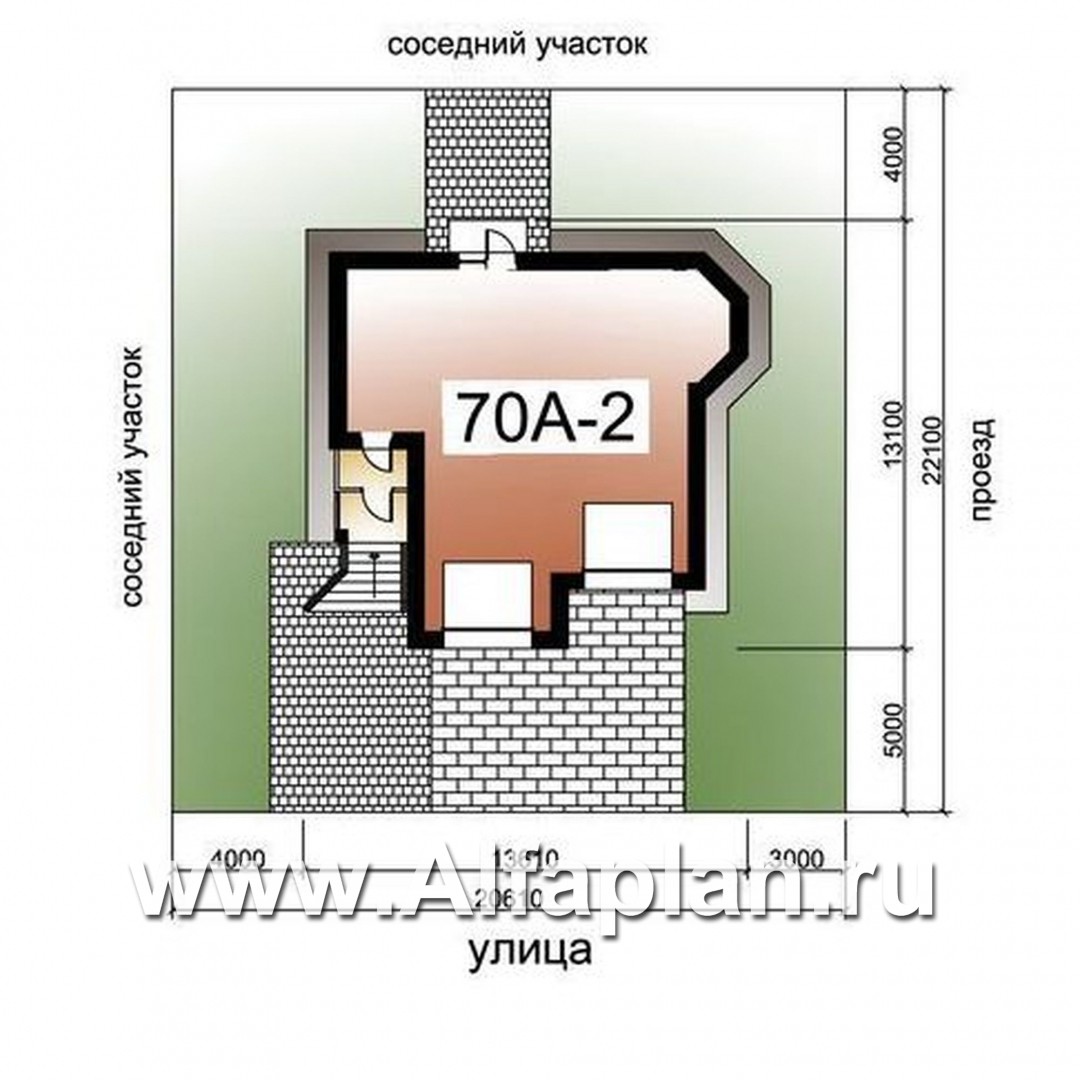 Можно гараж заменить на помещение другого назначения. Сделать это можно по месту, заменив гаражные ворота окном. Можно спроектировать такую веранду, ее можно сделать по принципу веранды в проекте 70В, или поднять на колоннах. Эти изменения мы можем отобразить для Вас в объеме Паспорта проекта (подробно см. в Разделе Сервис для заказчиков). К сожалению, выход из котельной на левый фасад невозможен, т.к. под крыльцом недостаточно высоты (1.4 м).