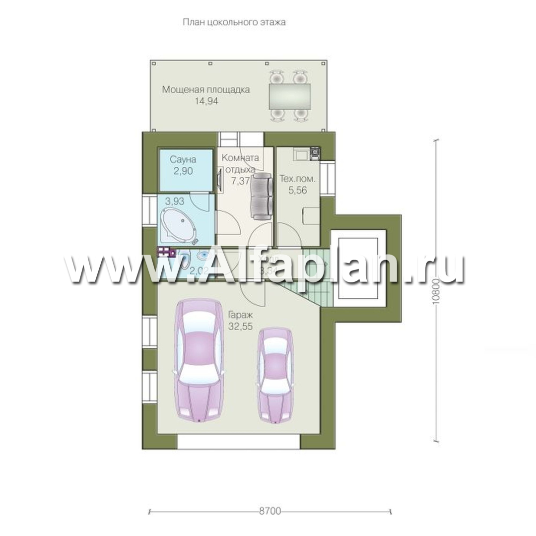 «Экспрофессо» - проект трехэтажного дома, с гаражом и сауной, цокольный этаж на уровне земли