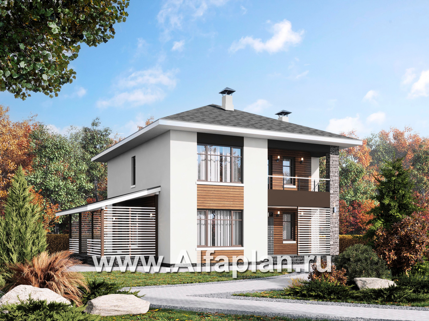 «Ильмень» - современный проект двухэтажного дома из кирпичей, с террасой на боковом фасаде