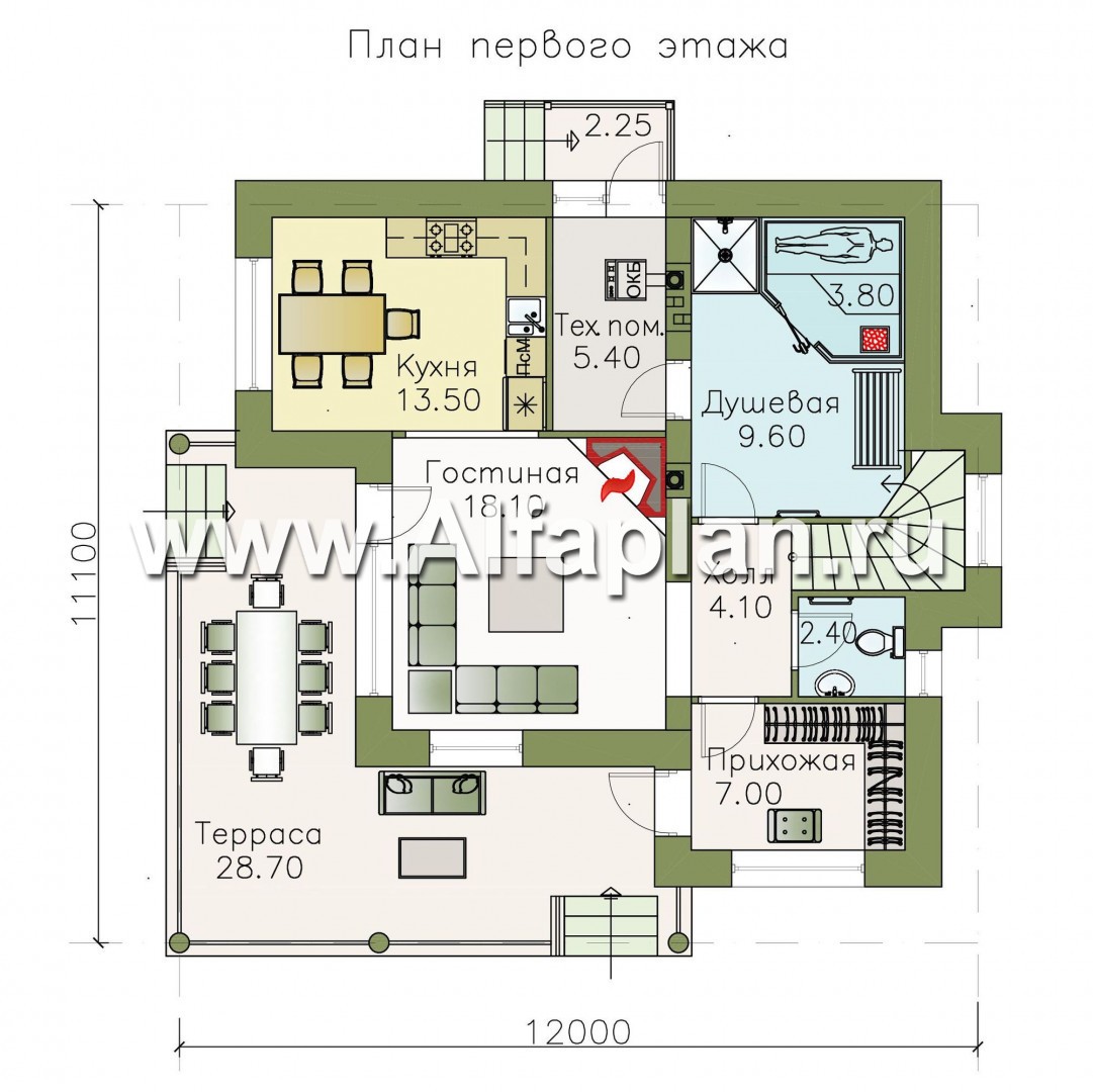 План дома выстроен вокруг угловой, диагональной оси. Гостиная двумя сторонами выходит на угловую террасу. К гостиной через проем примыкает столовая-кухня. На первом этаже предусмотрена сауна с душевой.